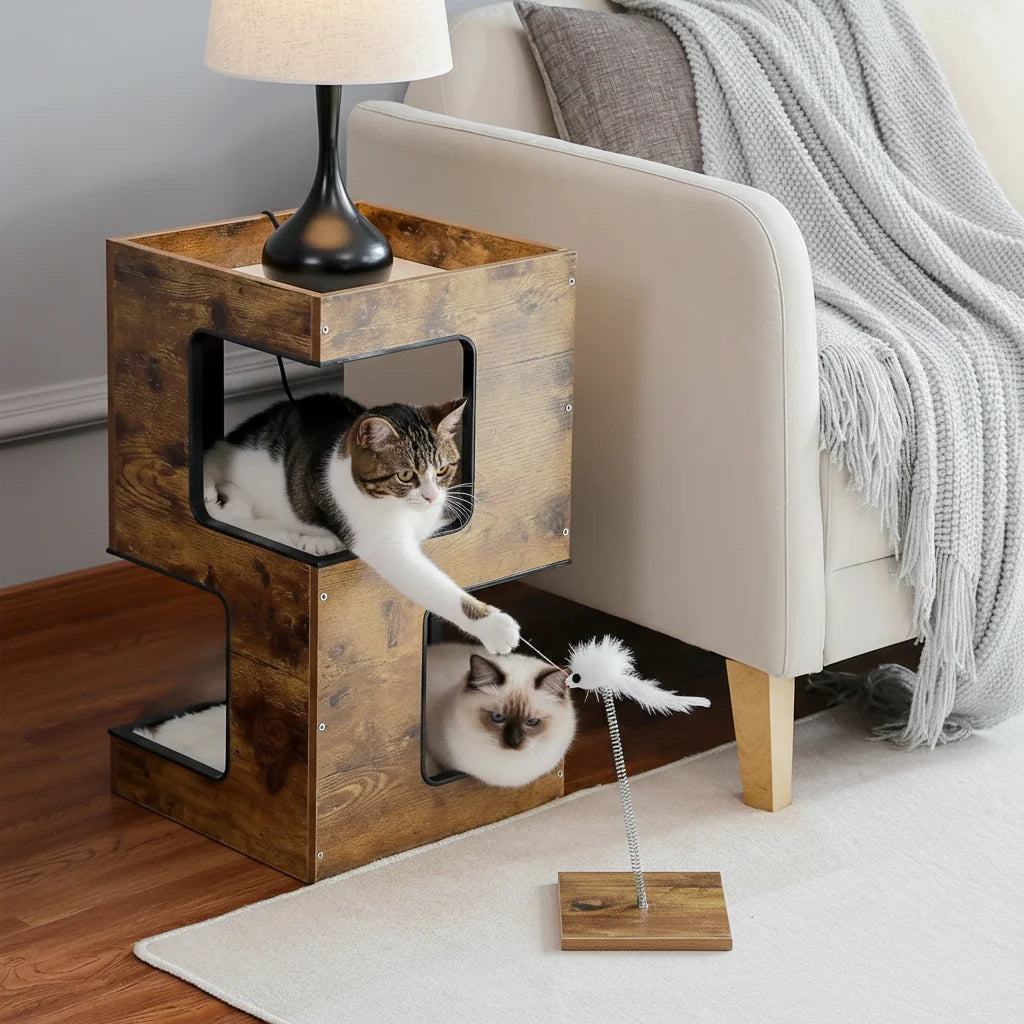 The ingenious two-tier design offers a serene lower haven for private naps and an elevated perch for surveying their domain. It's a thoughtfully curated space where every feline desire is met with grace.